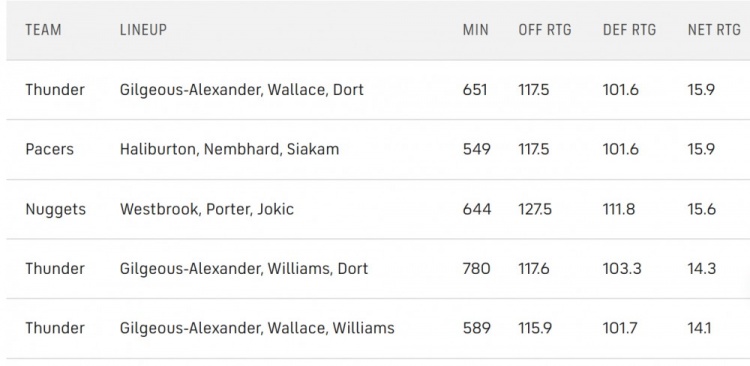 最強三人組:亞歷山大是一臺制勝機器,他的名字出現在本賽季5個最強三人組中的3個,就是最好的證明。一如既往,雷霆的陣容以其密不透風的防守為特點,但這些陣容的進攻肯定也不會太差。