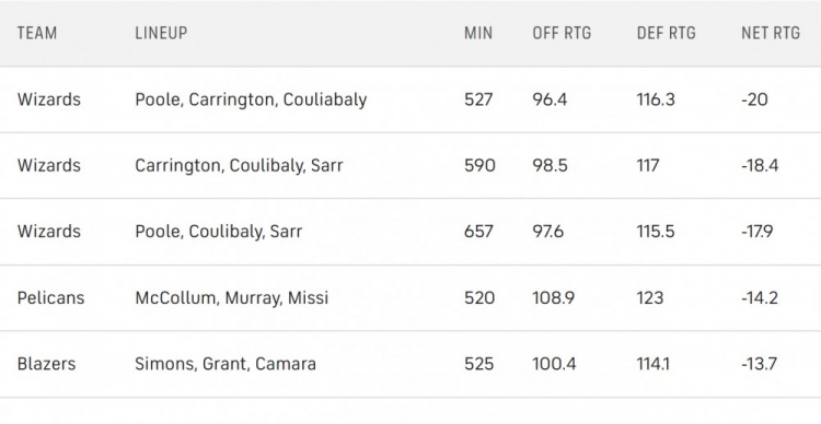 最差五人組:天哪,我們知道奇才真的很糟糕,但沒想到會這么糟糕。從紙面上看,這可能是奇才最好的五名球員,但他們每百回合的凈負分達到了33.5分!正如你所看到的,奇才與倒數第二的陣容之間存在著巨大的差距。作為參考,上賽季聯(lián)盟最差的五人組(籃網的丁威迪、卡梅隆-托馬斯、米卡爾-布里奇斯、卡梅隆-約翰遜和克拉克斯頓)的凈效率值為-17,而奇才幾乎比他們還要糟糕一倍,簡直令人難以置信。