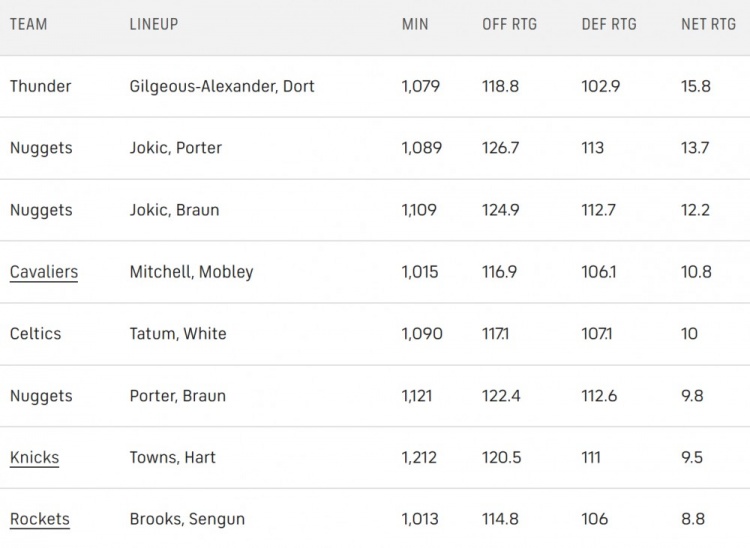 上圖可見:第一名為雷霆的亞歷山大和多特;第二名為掘金的約基奇和小波特;第三名為掘金的約基奇和布勞恩;第四名為騎士的米切爾和小莫布里;第五名為凱爾特人的塔圖姆和德里克-懷特;第六名為掘金的小波特和布勞恩;第七名為尼克斯的唐斯和哈特;第八名為火箭的狄龍-布魯克斯和申京。