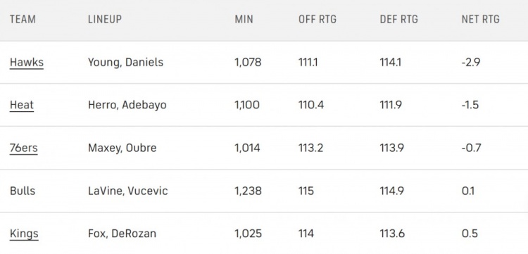 上圖可見:倒數第一為老鷹的特雷-楊和戴森-丹尼爾斯;倒數第二為熱火的希羅和阿德巴約;倒數第三為76人的馬克西和烏布雷;倒數第四為公牛的拉文和武切維奇;倒數第五為國王的??怂购偷铝_贊。