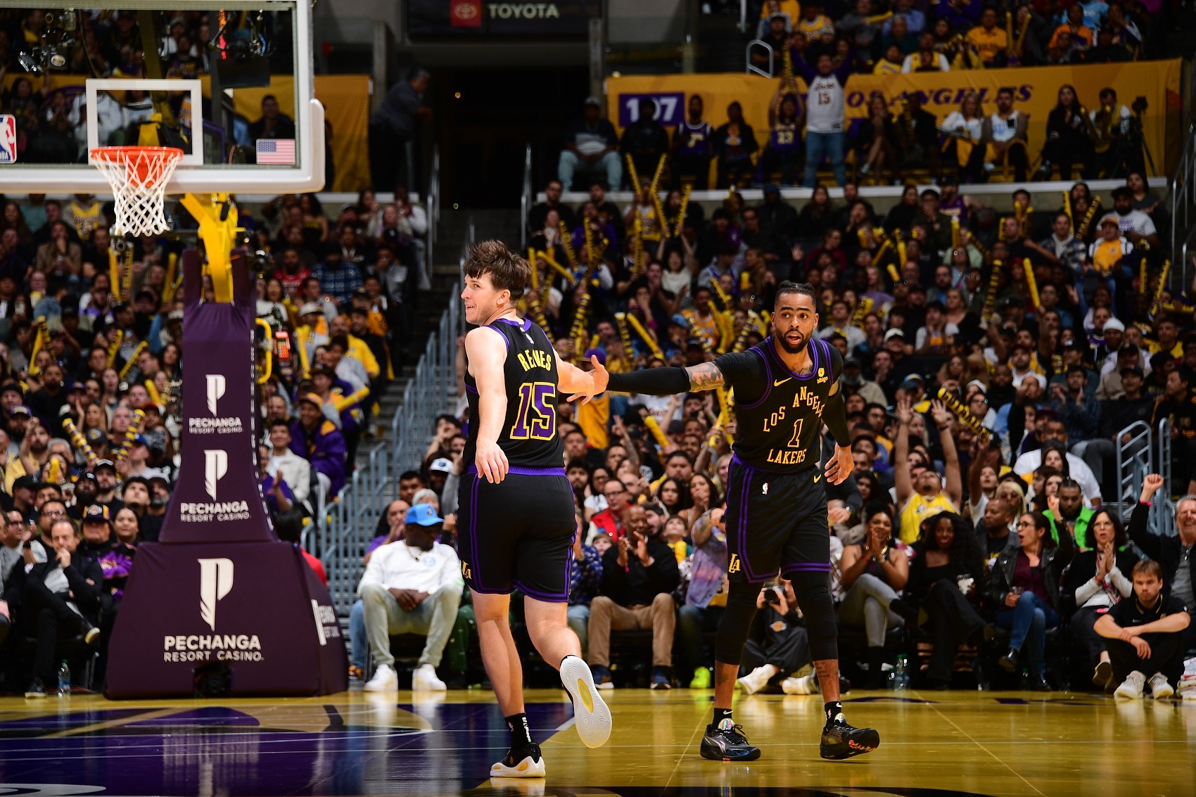 湖人與步行者一戰(zhàn)最后時刻,奧斯汀-里夫斯在全場湖人球迷“MVP”贊歌聲中兩罰全中,數(shù)據(jù)定格在45分、7籃板、7助攻、3搶斷。自2005年的科比之后,里夫斯是湖人單場砍下至少40分、5籃板、5助攻最年輕的球員。