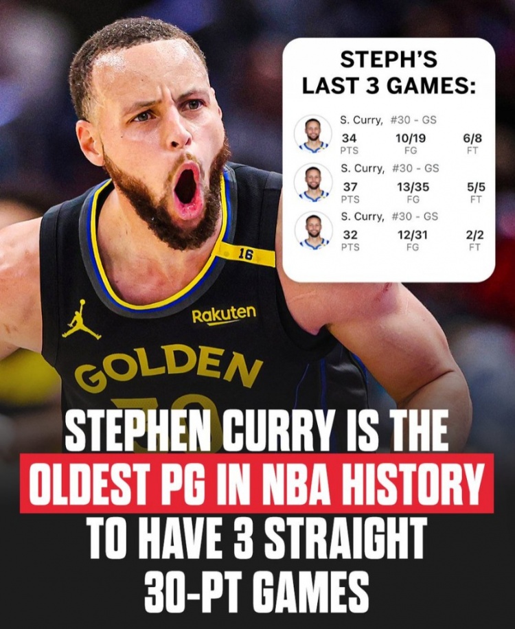 在過去的三場比賽中,庫里皆得到30+,他成為NBA歷史上第二位在36歲還能連續(xù)三場30+的球員,第一位是喬丹。