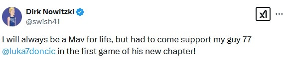 獨(dú)行俠名宿諾維茨基現(xiàn)場觀戰(zhàn),他發(fā)推寫道:“我永遠(yuǎn)都是獨(dú)行俠的一員,但我今天得來支持我的兄弟東契奇,看他開啟生涯新篇章的第一場比賽!”