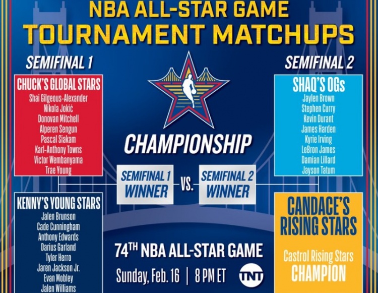 - 全明星正賽對陣情況:巴克利隊VS肯尼隊 奧尼爾隊VS新秀冠軍隊