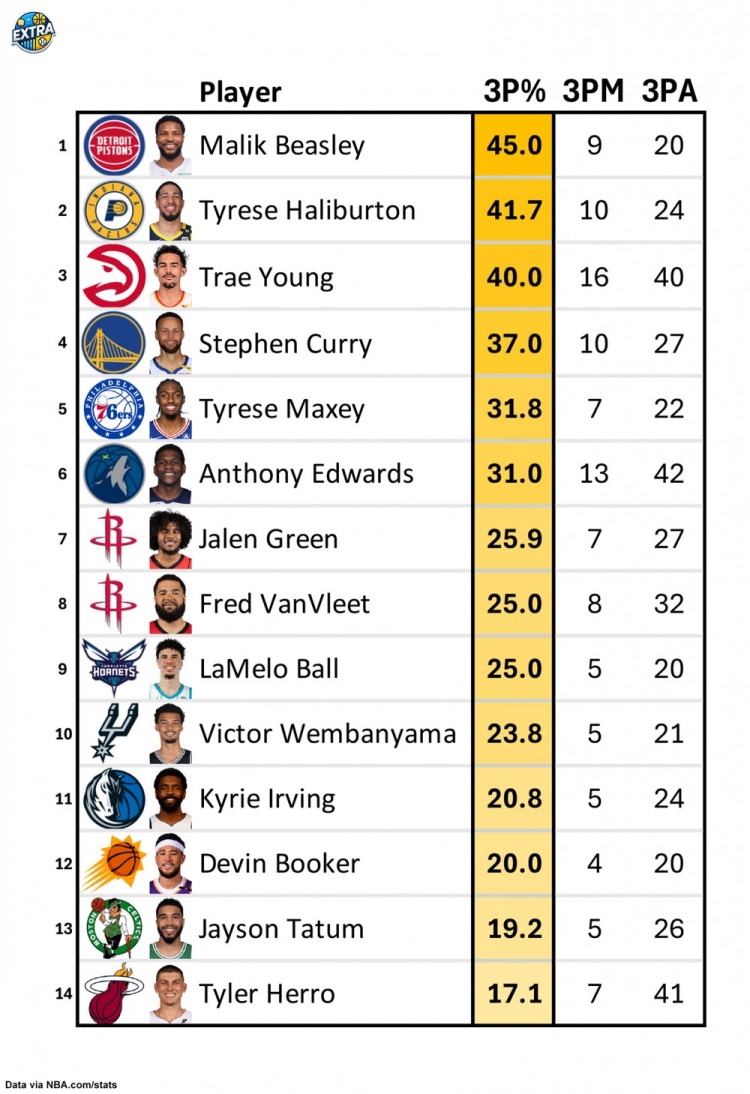 據(jù)統(tǒng)計,本賽季共有14名球員在關(guān)鍵時刻(常規(guī)時間最后5分鐘或加時賽且分差不超過5分)出手了至少20記三分,這14人按命中率排名比斯利最準,庫里排第4,文班第10,具體如下圖: