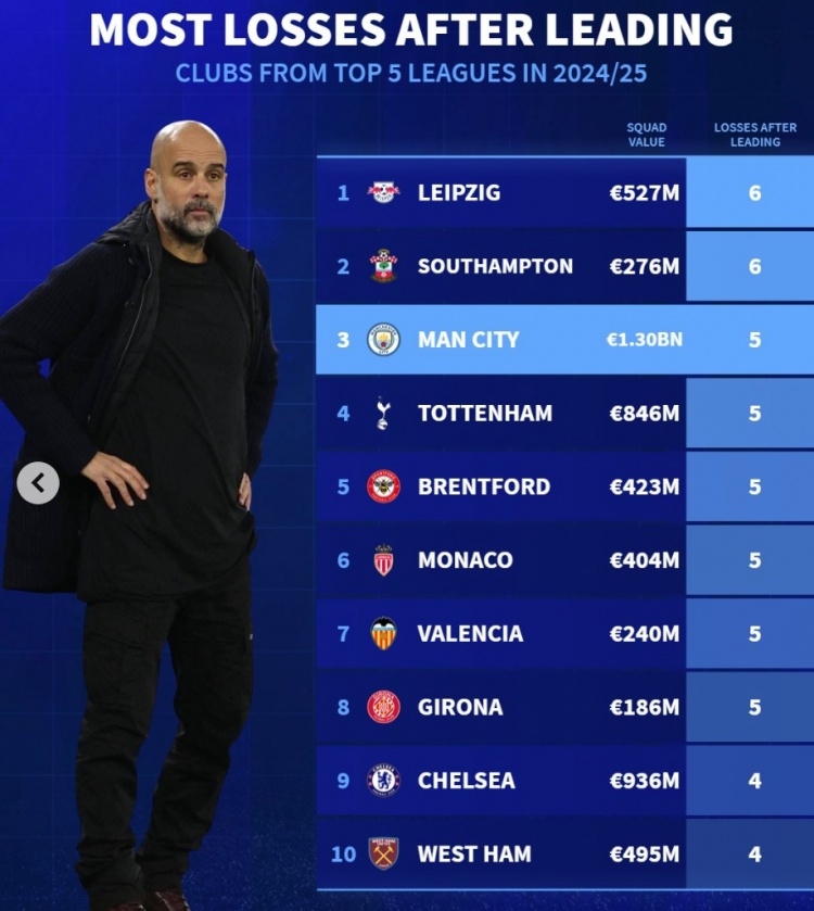 本賽季五大聯(lián)賽球隊(duì)被逆轉(zhuǎn)次數(shù)榜: