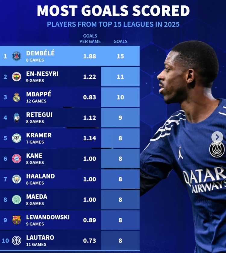 2月13日訊 《轉(zhuǎn)會市場》統(tǒng)計了2025年歐洲前15聯(lián)賽球員的各項賽事總進球榜單,登貝萊領(lǐng)跑。