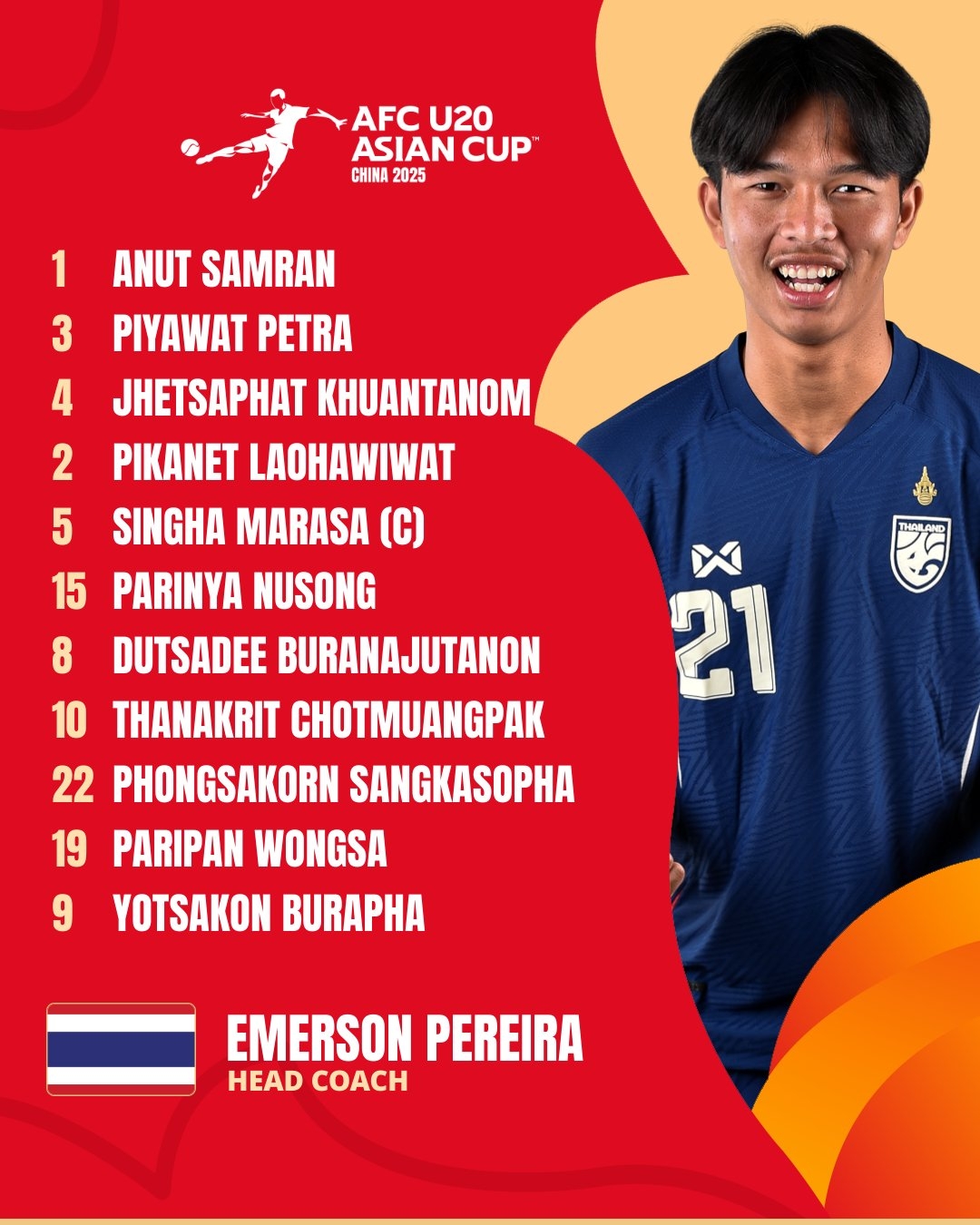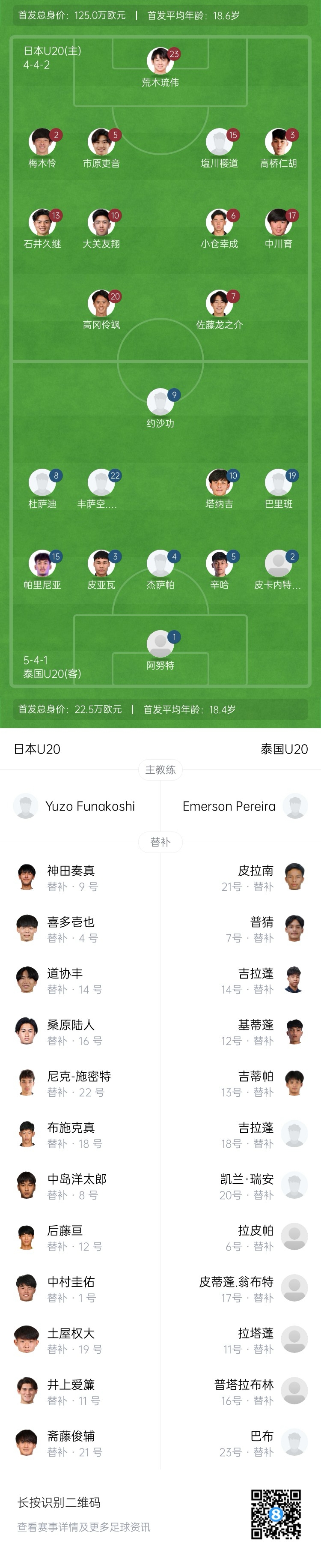 泰國(guó)U20首發(fā):1-阿努特、2-皮卡內(nèi)特-勞哈維瓦、3-皮亞瓦、4-杰薩帕、5-辛哈、15-帕里尼亞、8-杜薩迪、10-塔納吉、19-巴里班、22-豐薩空、9-約沙功