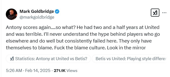 英國(guó)著名曼聯(lián)球迷頻道The United Stand的主理人Mark Goldbridge對(duì)此表示道:“安東尼又進(jìn)球了...那又怎么樣?他在曼聯(lián)待了2年半時(shí)間,表現(xiàn)很糟糕。我永遠(yuǎn)無(wú)法理解那些去其他地方表現(xiàn)很好的球員背后的炒作,不過(guò)他們總是在這里失敗。他們只能怪自己,去他*的責(zé)備文化,照照鏡子吧?!?/p>