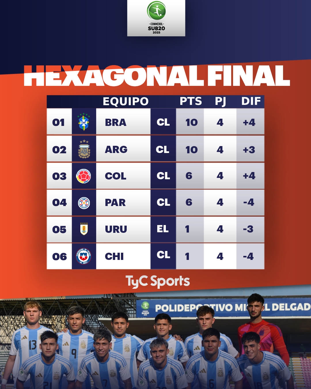 目前,巴西10分+4凈勝球排名第一,阿根廷10分+3凈勝球排名第二,哥倫比亞6分+4凈勝球排名第三,巴拉圭6分-4凈勝球排名第四,烏拉圭1分-3凈勝球排名第五,智利1分-4凈勝球排名第六,賽事冠軍將在最后一輪決出。