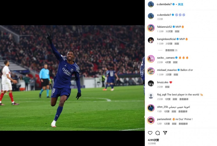 1月30日訊 巴黎在本輪歐冠4-1客勝斯圖加特,上演個人歐冠生涯首個帽子戲法的登貝萊堪稱最大功臣。