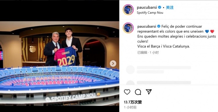 庫巴西本人也通過社媒曬出自己和巴薩主席拉波爾塔的合照,兩人共同手持印有2029字樣的巴薩球衣,庫巴西還表示:“很高興能夠繼續(xù)為巴薩俱樂部效力??????,我們還會共同經(jīng)歷很多歡樂與慶祝,巴薩球迷們!巴薩萬歲!加泰羅尼亞萬歲!”