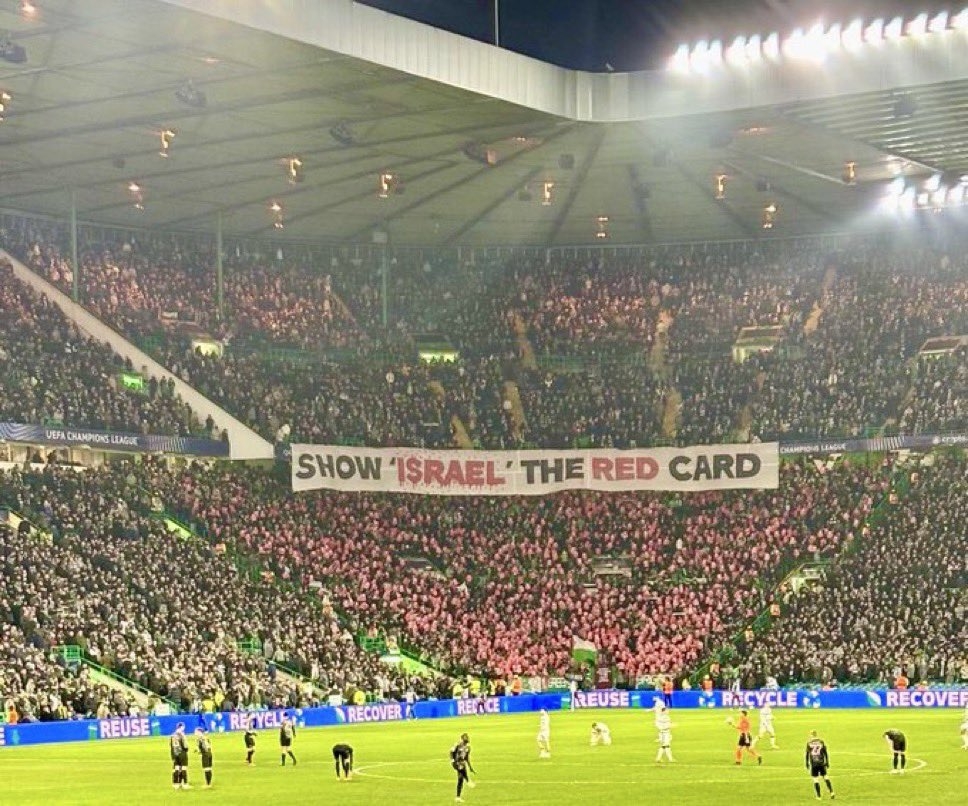 抗議以色列,凱爾特人球迷在對(duì)陣拜仁時(shí)舉橫幅:向以色列出示紅牌