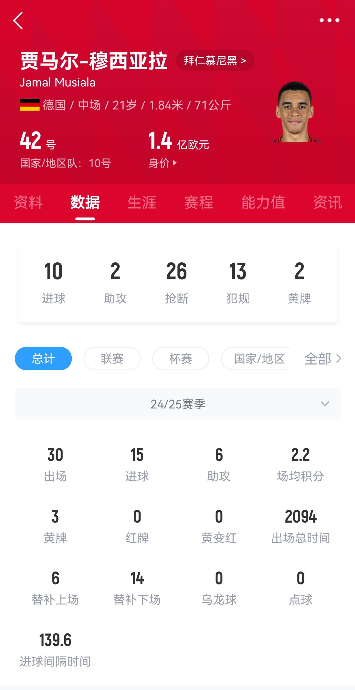 穆西亞拉現(xiàn)年21歲,德國籍攻擊型中場。他青少年時(shí)期曾在切爾西梯隊(duì)接受訓(xùn)練,2019年他轉(zhuǎn)投拜仁青訓(xùn)。2020年夏天穆西亞拉正式進(jìn)入拜仁一線隊(duì),至今已經(jīng)代表球隊(duì)出戰(zhàn)193場,貢獻(xiàn)58球38助。在國家隊(duì)層面,穆西亞拉已經(jīng)代表德國成年隊(duì)出戰(zhàn)38場打進(jìn)7球。穆西亞拉現(xiàn)如今的德轉(zhuǎn)身價(jià)已達(dá)到1.4億歐元。