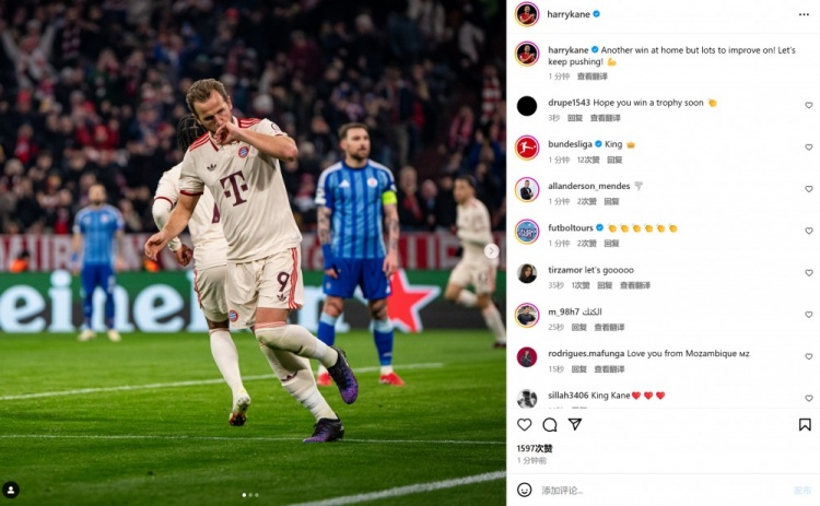 1月30日訊 在本輪歐冠,拜仁3-1擊敗布拉迪斯拉發(fā)。本場(chǎng)比賽凱恩破門得分,賽后凱恩也在個(gè)人社媒曬出本場(chǎng)慶祝進(jìn)球的照片,配文寫道:“又一個(gè)主場(chǎng)勝利,但是我們還有很多需要提升之處,讓我們繼續(xù)努力!” 本文標(biāo)簽: 足球 德甲 拜仁慕尼黑