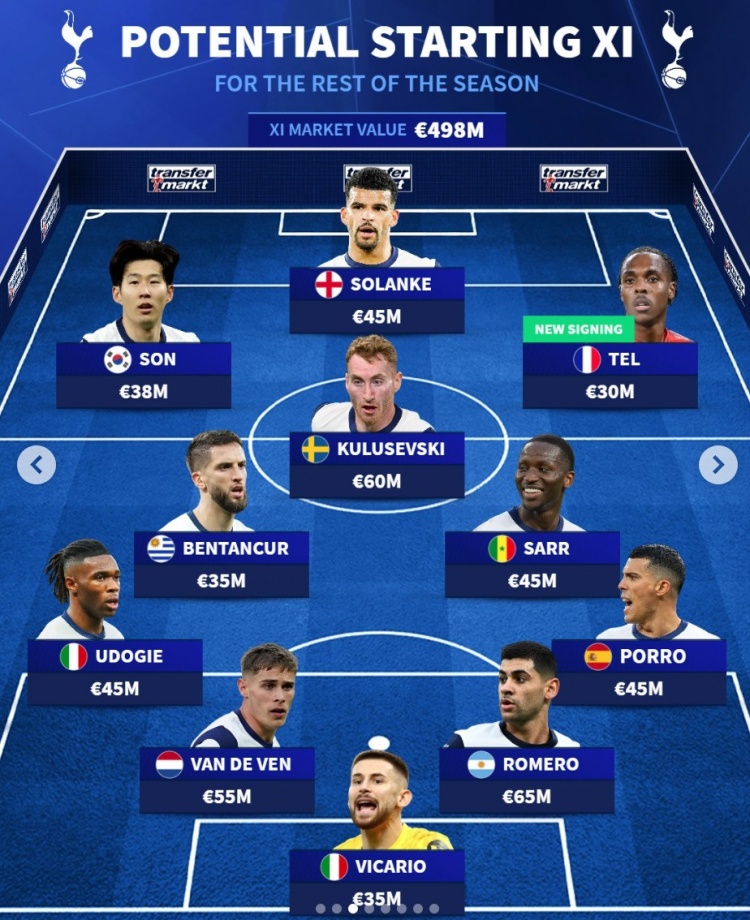 德轉(zhuǎn)預(yù)測熱刺下半程首發(fā)陣:總身價(jià)4.98億歐