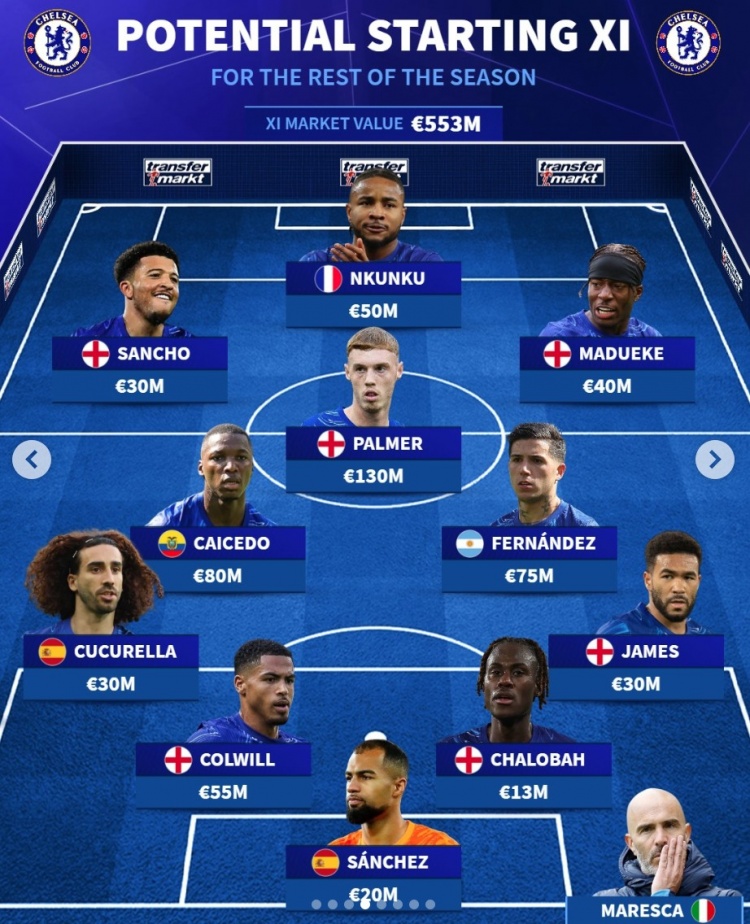 德轉(zhuǎn)預(yù)測切爾西下半程首發(fā)陣:總身價(jià)5.53億歐元