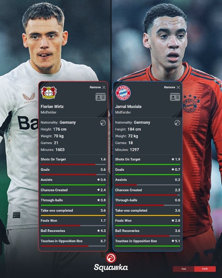 2月15日訊 勒沃庫森將在本輪德甲焦點戰(zhàn)迎戰(zhàn)拜仁,兩位德國帝星將正面對決。squawka也對比了兩人本賽季德甲關鍵數據情況。