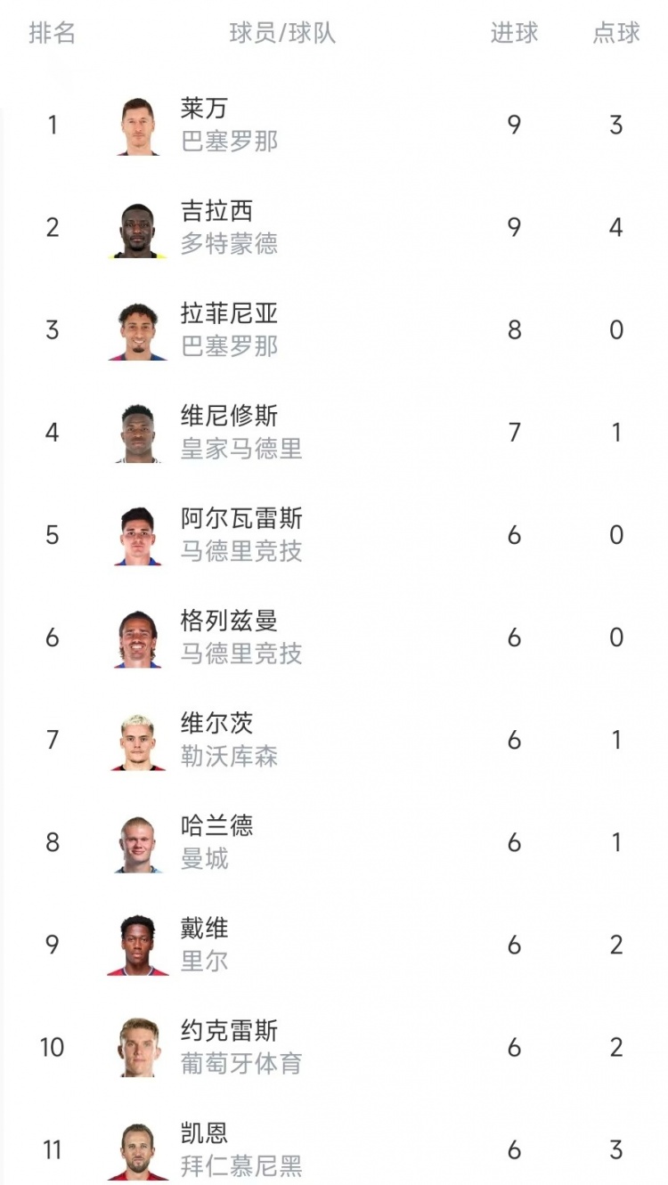 1月30日訊 本賽季歐冠聯(lián)賽階段比賽戰(zhàn)罷,萊萬、吉拉西打進9球并列射手榜首位。
