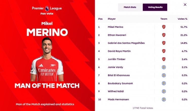2月15日訊 本輪英超比賽,阿森納客場(chǎng)2-0戰(zhàn)勝萊斯特城。賽后在英超官網(wǎng)的球迷票選全場(chǎng)最佳球員中,替補(bǔ)登場(chǎng)打進(jìn)2球的梅里諾拿到51.7%的得票率,成功當(dāng)選。 本文標(biāo)簽: 足球 英超 阿森納