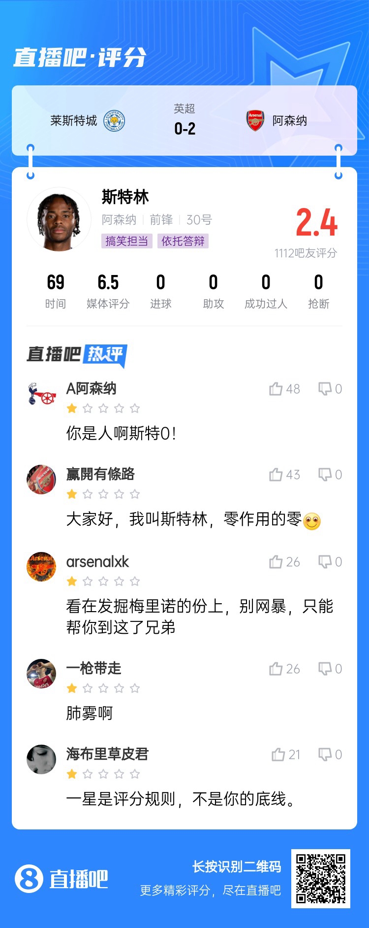 依托答辯!吧友給斯特林打2.4超低分:一星是下限,不是你的底線