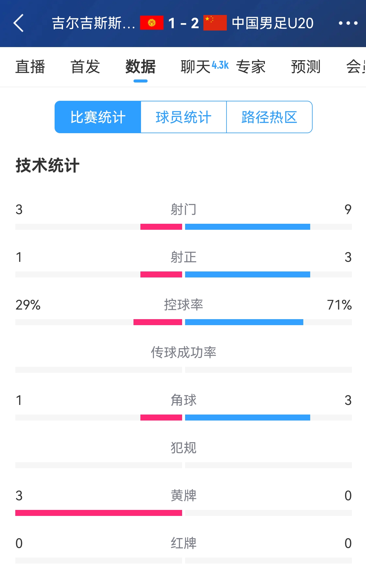 02月15日訊 上半場結束,國青2-1領先吉爾吉斯斯坦,在數據上中國國青全面領先對手。