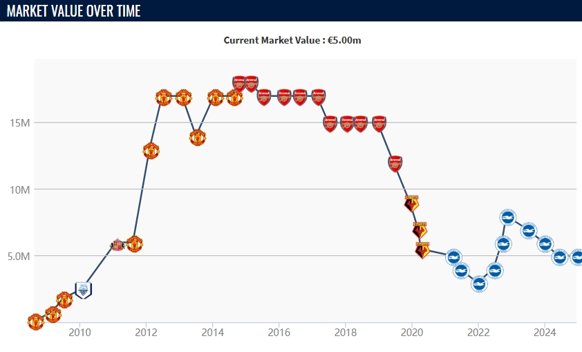 維爾貝克現(xiàn)年34歲,出自曼聯(lián)青訓(xùn),球員在2014年以2000萬歐元轉(zhuǎn)會費(fèi)轉(zhuǎn)投阿森納。維爾貝克在2019年自由身轉(zhuǎn)會至沃特福德后,布萊頓于2020年10月將其簽下,并效力至今。本賽季這位英格蘭前鋒代表球隊(duì)英超出場19次,打進(jìn)6球并有4次助攻。目前球員德轉(zhuǎn)身價(jià)為500萬歐元。