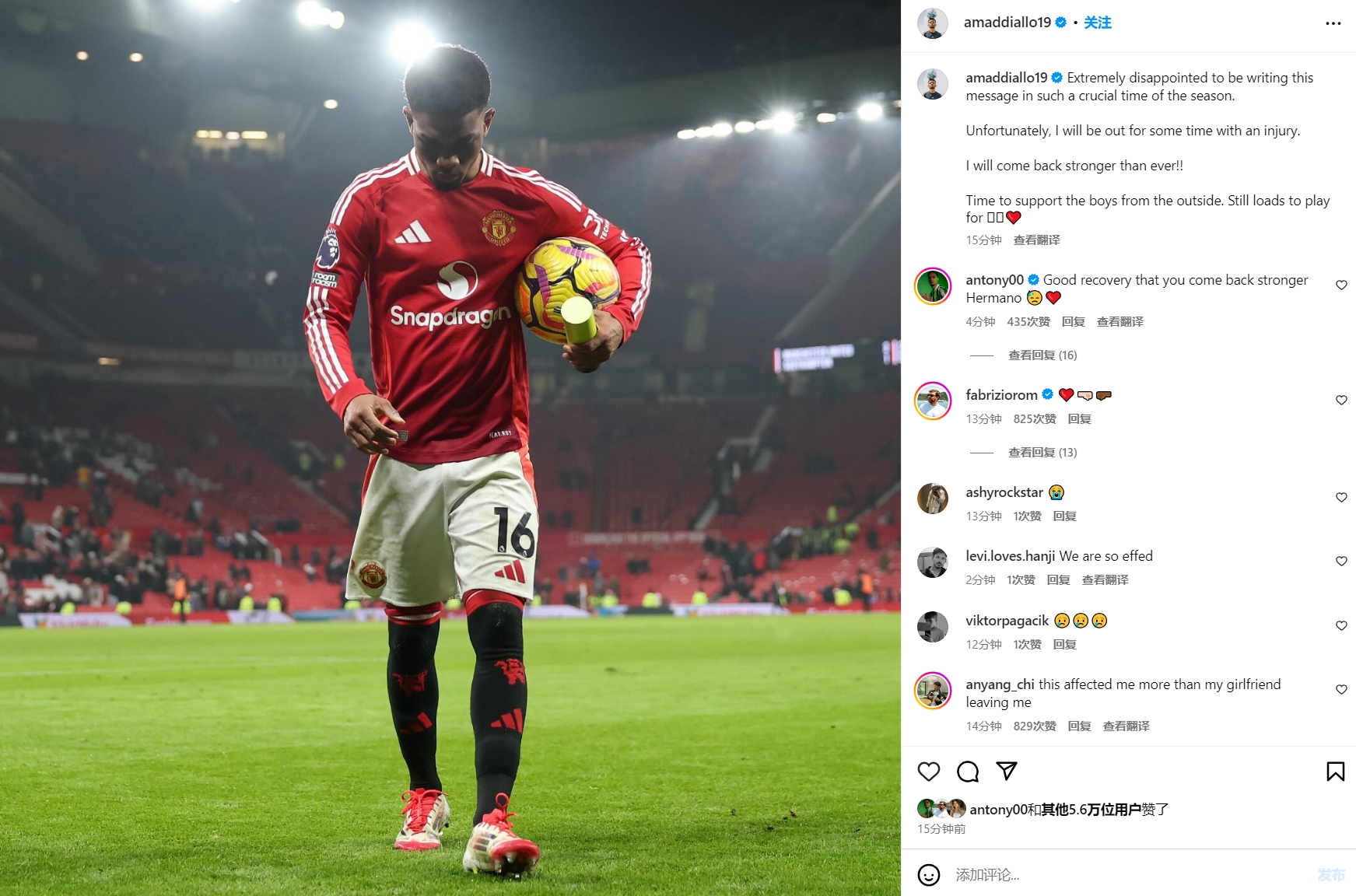 2月16日訊 多家媒體報道稱,阿瑪德訓練中腳踝韌帶受傷,預計賽季報銷。他本人更新了社媒,確認自己的確不幸遭遇傷情。阿瑪德寫道:在賽季如此關鍵的時刻寫下這段話,我感到非常失望。不幸的是,我將因傷缺陣一段時間。復出時我會比以往更強大!!現在要在場外支持小伙子們了。我們還有很多目標要實現??。曼聯(lián)外租球員安東尼也安慰阿瑪德:兄弟,祝你康復過程一切順利,希望復出時你能更加強大。 本文標簽: 足球 英超 曼聯(lián)