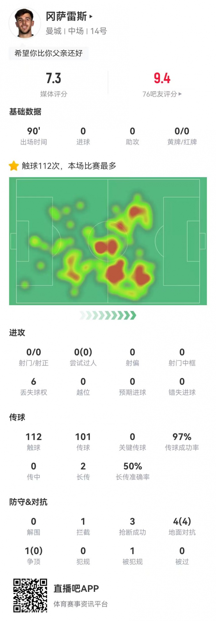 岡薩雷斯本場(chǎng)比賽觸球達(dá)到112次,是全場(chǎng)最多的球員。他的傳球成功率也有97%,同樣是全場(chǎng)最高。在防守端他也有著1攔截3搶斷和4次對(duì)抗全成功的戰(zhàn)績(jī),僅有爭(zhēng)頂失敗一次。