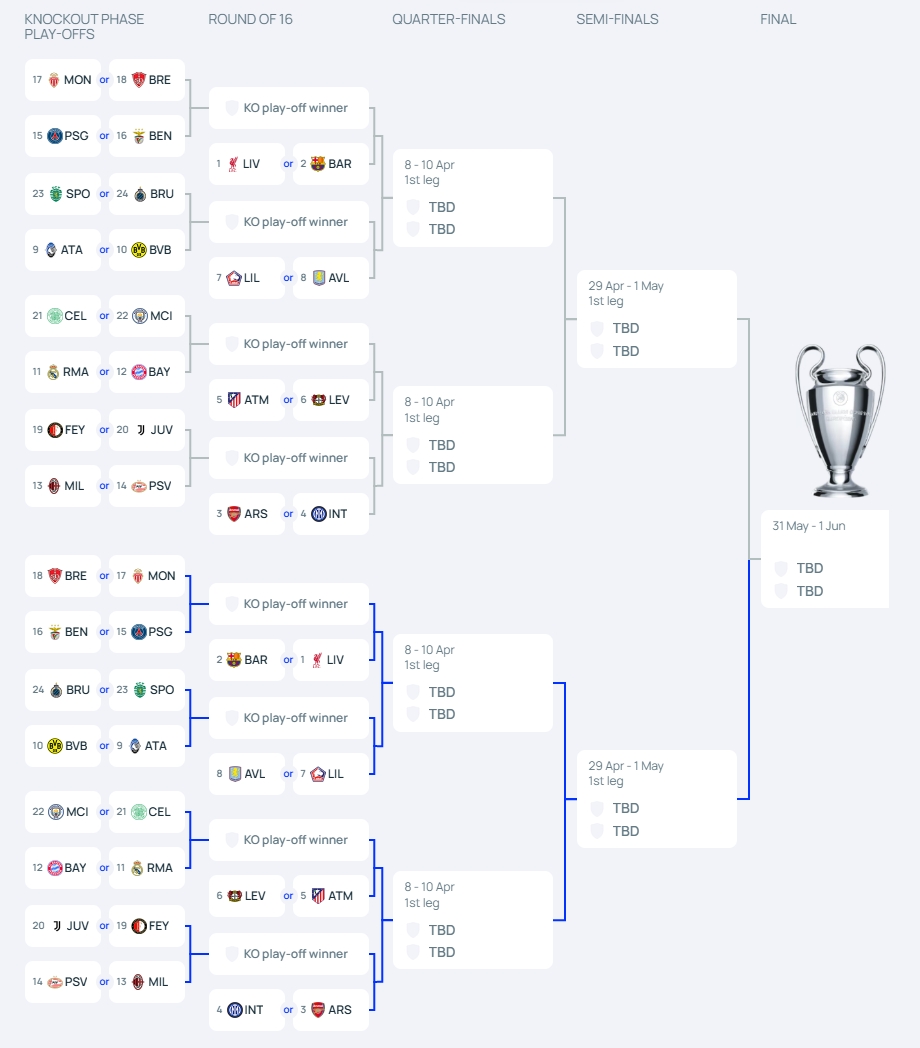 球隊(duì)的潛在對(duì)手也由其聯(lián)賽階段排名決定。附加賽中,排名第9或第10的球隊(duì),將對(duì)陣排名第23或24名的球隊(duì);排名第11名或12名的球隊(duì),將對(duì)陣排名第21或22名的球隊(duì),以此類推。16強(qiáng)抽簽中,聯(lián)賽階段排名第1或第2的球隊(duì),其對(duì)手將來自附加賽15/16/17/18名球隊(duì)的晉級(jí)者;排名第3或第4的球隊(duì),其對(duì)手將來自附加賽13/14/19/20的晉級(jí)球隊(duì),以此類推。