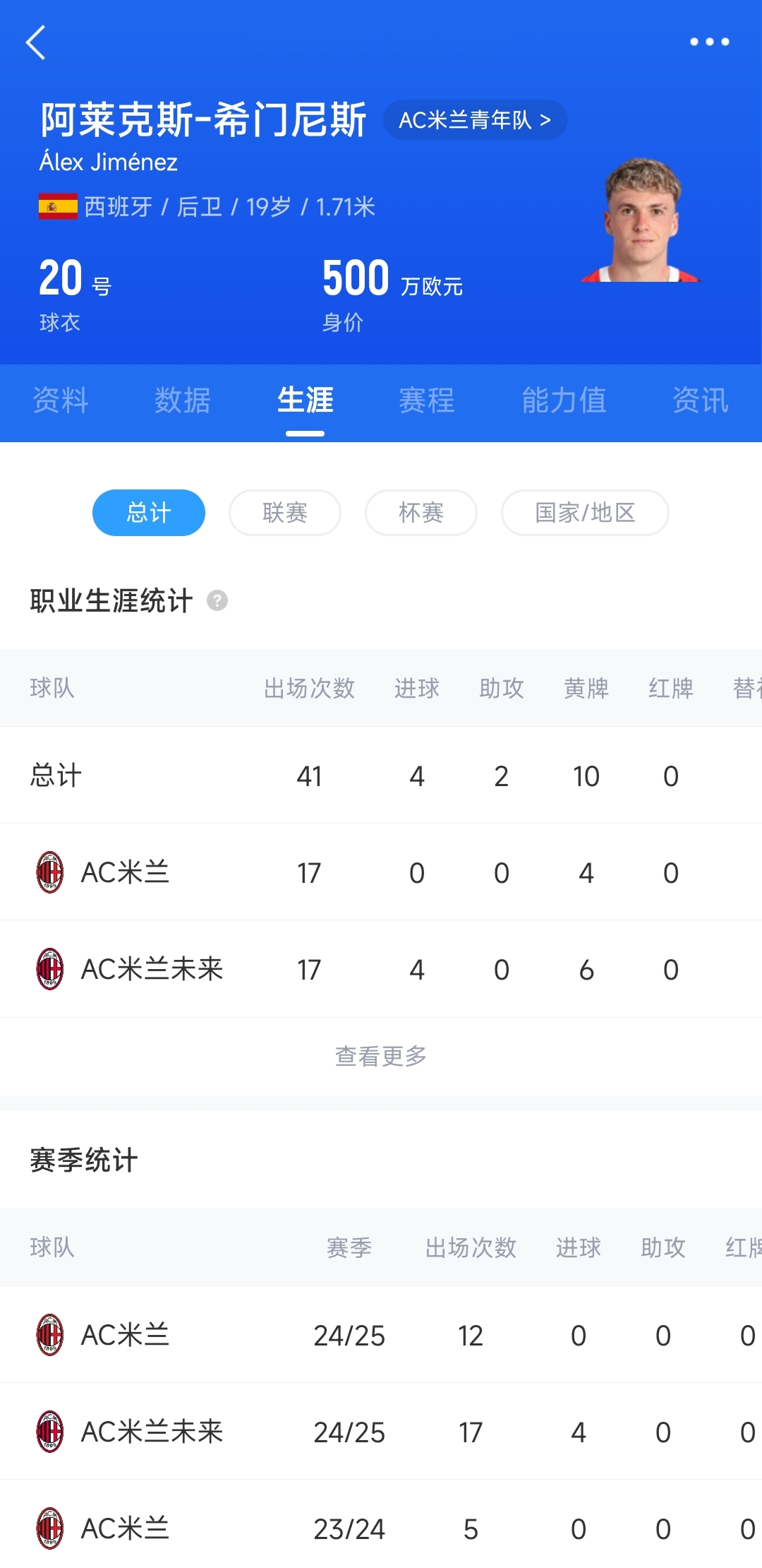 2024年夏窗,希門尼斯以500萬歐元的買斷費正式從皇馬加盟米蘭,簽約至2028年。本賽季希門尼斯已經(jīng)代表AC米蘭出戰(zhàn)12場比賽,出場時間685分鐘。