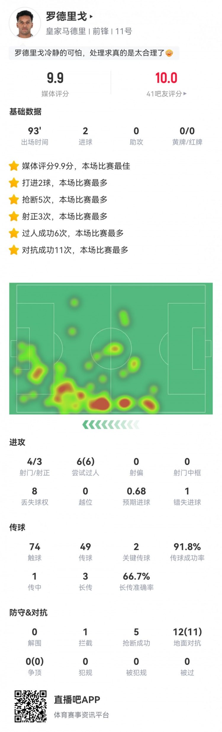 1月30日訊 歐冠末輪,皇馬3-0客勝布雷斯特。此役羅德里戈發(fā)揮出色雙響建功,多項數(shù)據(jù)全場最高。球員全場重點數(shù)據(jù)如下↓4射3正2粒進球6次過人全部成功8次丟失球權(quán)預(yù)期進球0.681次錯失進球良機74次觸球傳球成功率91.8%2次關(guān)鍵傳球12次對抗成功11次5次搶斷全場最高9.9分 本文標(biāo)簽: 足球 西甲 皇家馬德里 歐冠