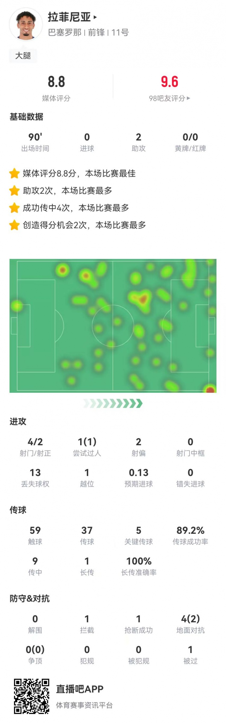 1月30日訊 巴薩在本輪歐冠2-2戰(zhàn)平亞特蘭大,拉菲尼亞本場數(shù)據(jù)如下: