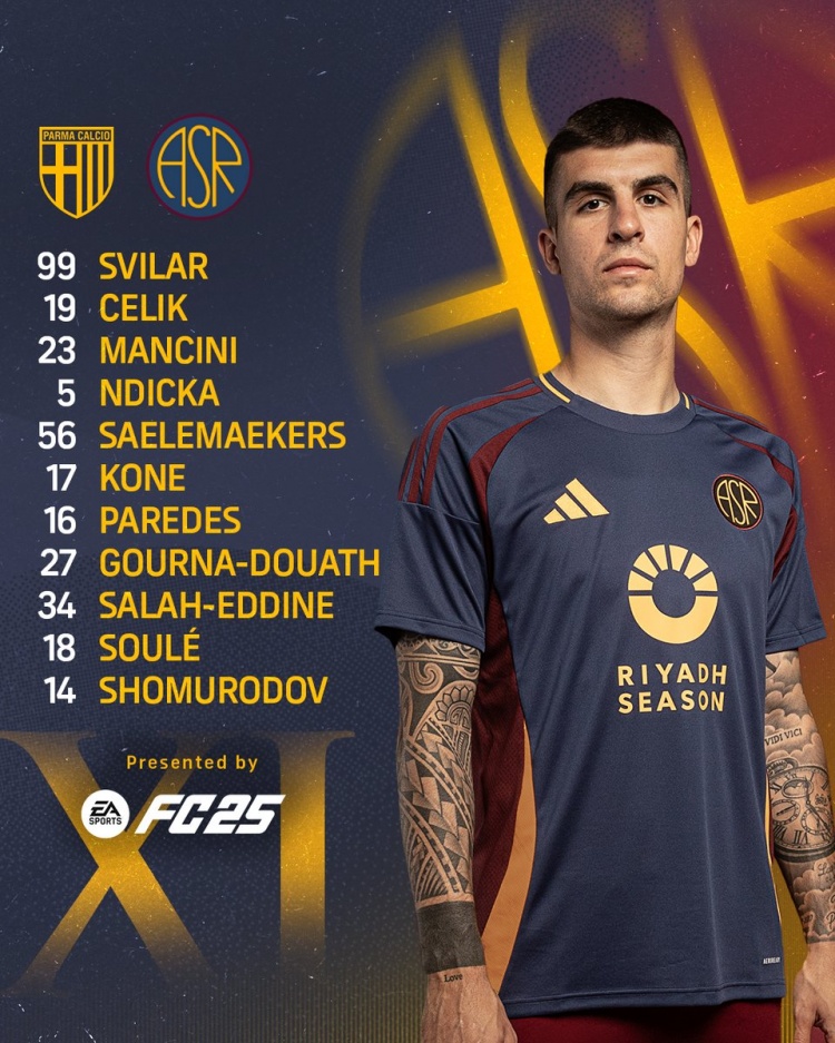羅馬首發(fā):99-斯維拉爾、19-切利克、23-詹盧卡-曼奇尼、5-恩迪卡、56薩勒馬科爾斯、17-科內(nèi)、16-帕雷德斯、27-杜亞斯、34-薩拉赫-埃丁、18-蘇萊、14-肖穆羅多夫