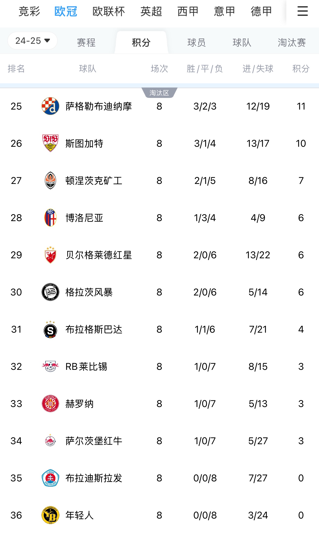1月30日訊 北京時間1月30日星期四04:00,歐冠聯(lián)賽階段第8輪,18場比賽同時開打,最終各支球隊的命運也揭曉,排名25-36名的12支球隊正式出爐。由于賽事改制,歐冠聯(lián)賽階段出局的球隊正式被淘汰,無緣任何歐戰(zhàn)賽事。