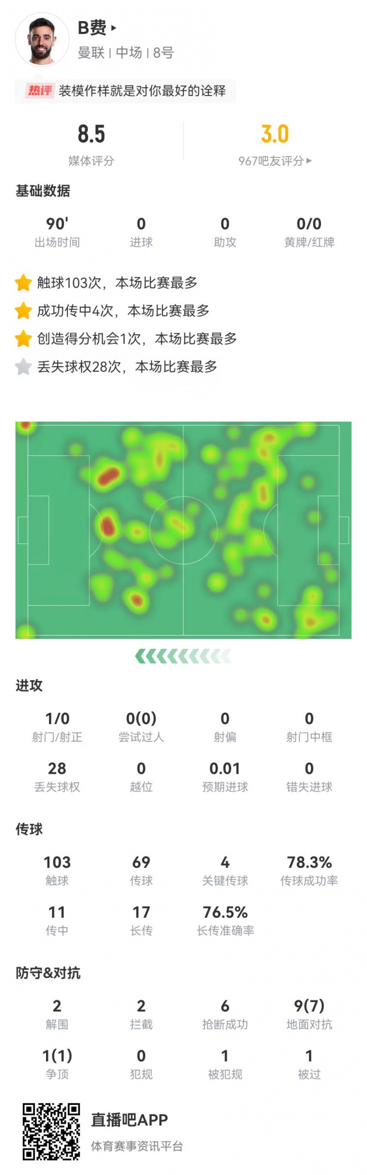 2月17日訊 曼聯(lián)在本輪英超0-1不敵熱刺,B費本場數(shù)據(jù)如下:首發(fā)踢滿全場103觸球69傳球、54成功,成功率78%4關鍵傳球11傳中、4成功17長傳、13成功1創(chuàng)造重大機會1射門、0射正10對抗、8成功28丟失球權1造犯規(guī)2解圍2攔截6搶斷獲評8.5分全隊最高 本文標簽: 足球 英超 熱刺 曼聯(lián)