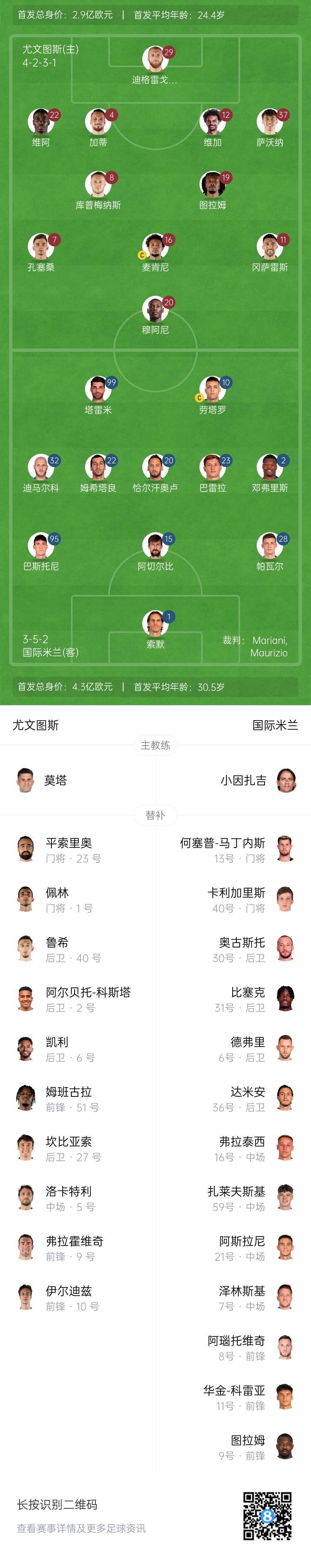 尤文首發(fā):29-迪格雷戈里奧、22-維阿、4-加蒂、12-維加、37-薩沃納、8-庫普梅納斯、19-凱夫倫-圖拉姆、7-小孔塞桑、16-麥肯尼、11-尼古拉斯-岡薩雷斯、20-穆阿尼