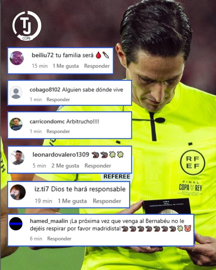 其中不乏極其惡劣的死亡恐嚇,包括“我要?dú)⒘四恪?、“你該?dān)心孩子們的安危”、“街頭遇見必讓你拄拐”以及“下次來伯納烏別想呼吸,皇馬球迷們請堵死他”等言論。