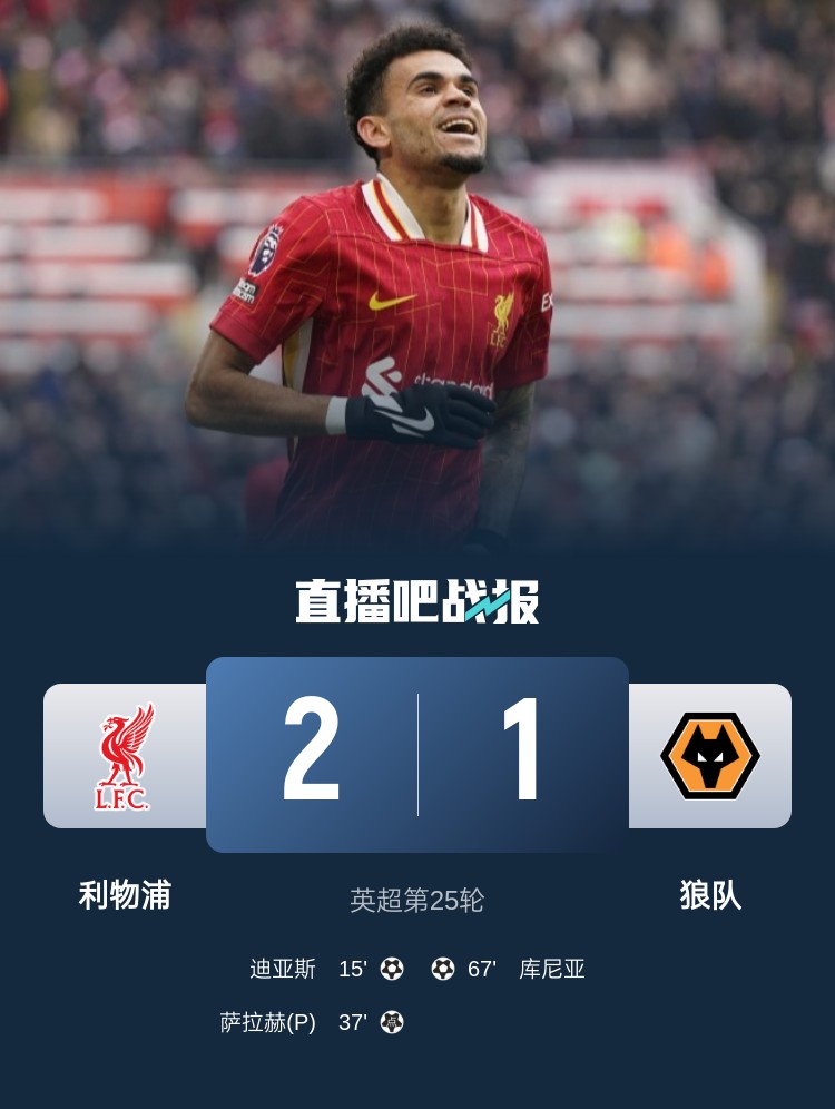 英超第25輪,利物浦2-1戰(zhàn)勝狼隊(duì),迪亞斯破門、薩拉赫點(diǎn)射。