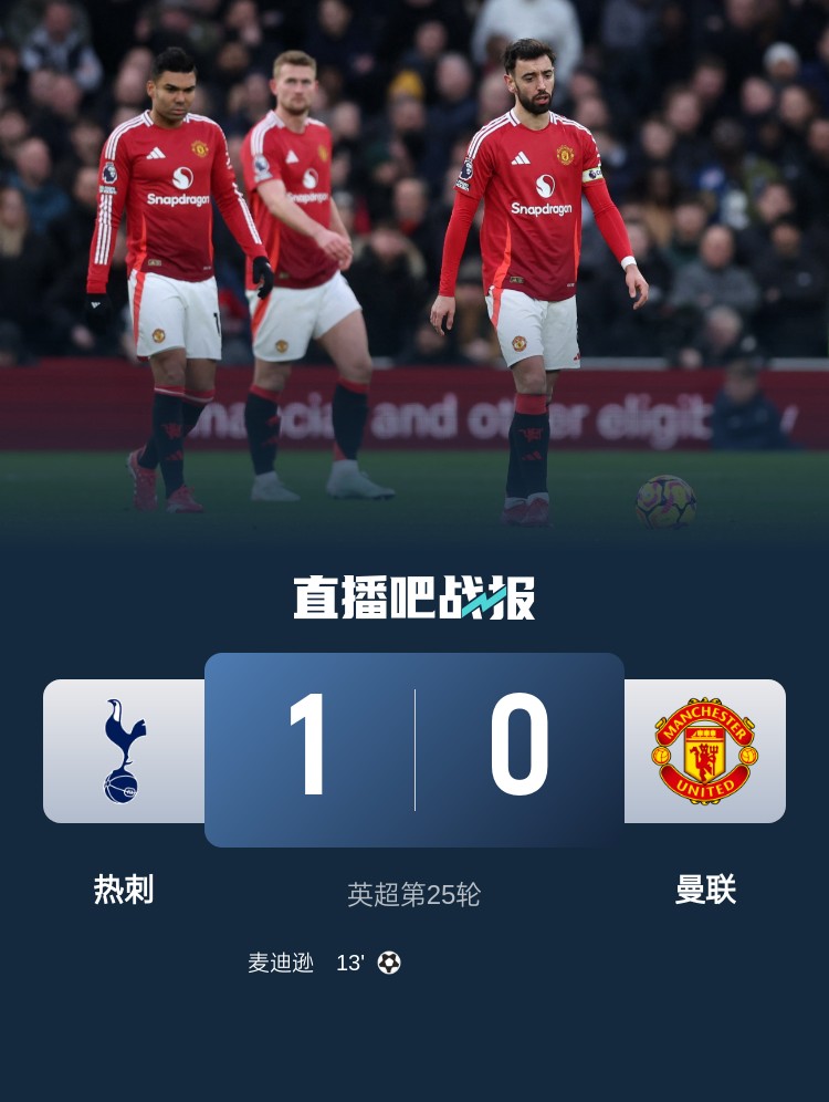 英超第25輪,熱刺主場(chǎng)1-0曼聯(lián),麥迪遜制勝,加納喬失良機(jī)。