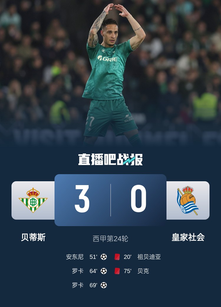 西甲第24輪,貝蒂斯3-0皇家社會(huì),安東尼世界波,羅卡梅開(kāi)二度。