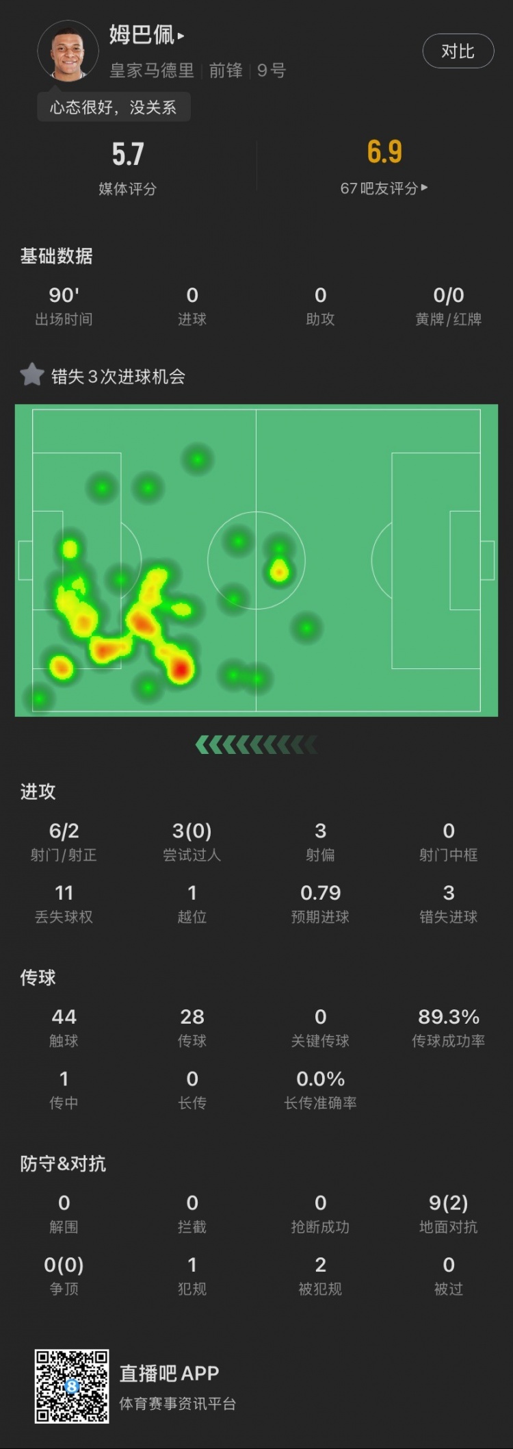 1月30日訊 在剛剛結(jié)束的歐冠聯(lián)賽階段最后一輪比賽中,皇馬客場3-0擊敗布雷斯特。本場比賽,姆巴佩發(fā)揮欠佳,評分僅5.7,全場最低。姆巴佩本場主要數(shù)據(jù)↓射門:6射正:2錯失進球機會:3過人:嘗試3次,成功0次越位:1觸球:44丟失球權(quán):11傳球:28傳球成功率:89.3%傳中:1地面對抗:參與9次,成功2次犯規(guī):1造犯規(guī):2 本文標(biāo)簽: 足球 西甲 皇家馬德里 歐冠 姆巴佩