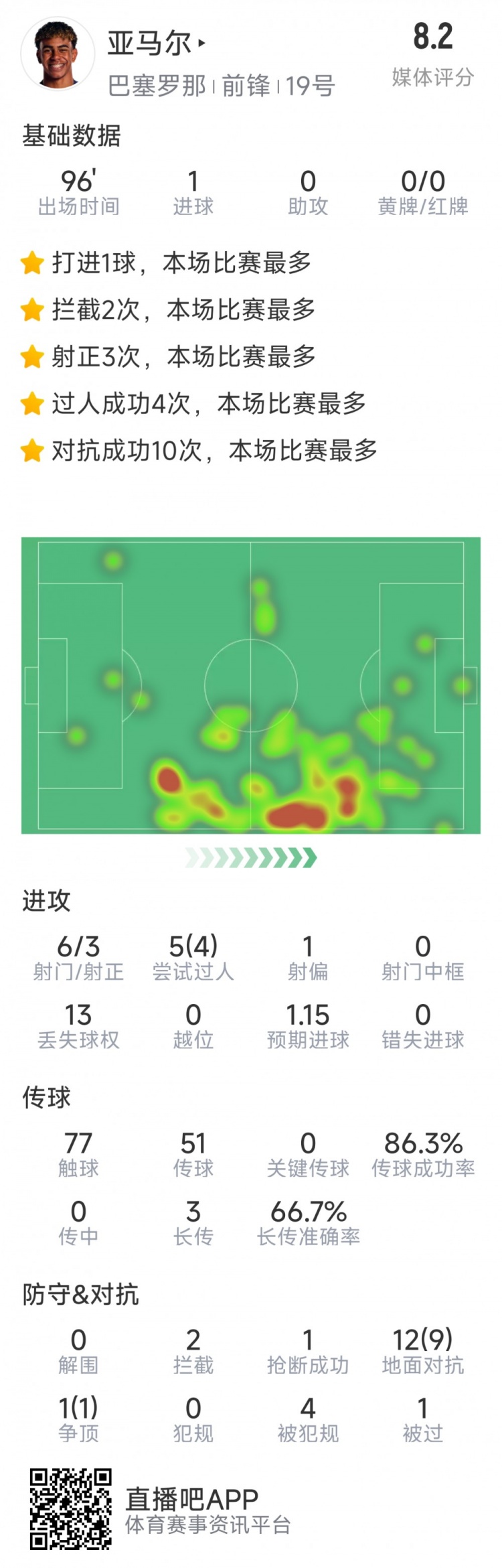 1月30日訊 在本輪歐冠,巴薩2-2戰(zhàn)平亞特蘭大,亞馬爾打進(jìn)一球,以下為他在本場(chǎng)數(shù)據(jù):比賽時(shí)間90分鐘1粒進(jìn)球6射3正5次過(guò)人4次成功77次觸球傳球成功率86.3%2次攔截1次搶斷13次對(duì)抗10次成功sofa評(píng)分8.2分 本文標(biāo)簽: 足球 西甲 巴塞羅那