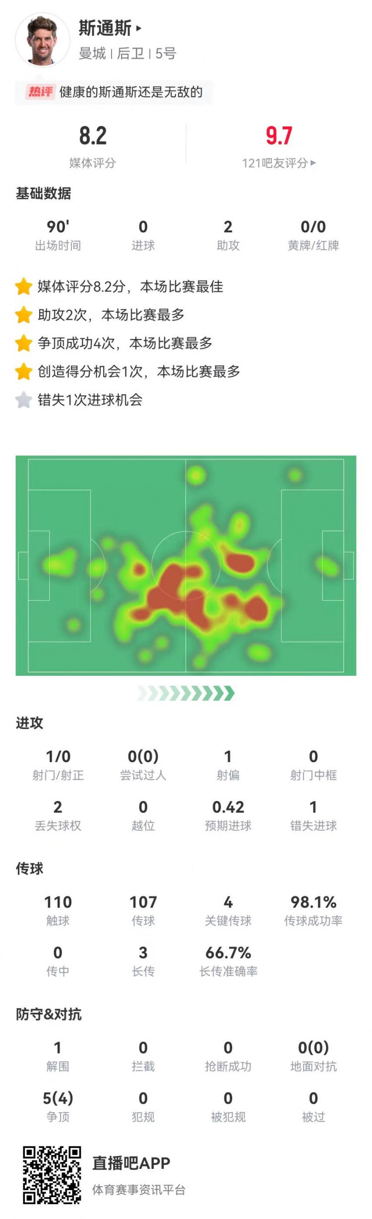 1月30日訊 曼城在本輪歐冠逆轉(zhuǎn)布魯日,斯通斯本場數(shù)據(jù)如下:首發(fā)踢滿全場預(yù)期進球0.422助攻預(yù)期助攻0.071解圍5對抗、4成功2丟失球權(quán)110觸球107傳球、105成功,成功率98%4關(guān)鍵傳球3長傳、2成功1創(chuàng)造重大機會1射門、0射正1錯失重大機會獲評8.2分全場最高 本文標簽: 足球 英超 曼城 歐冠