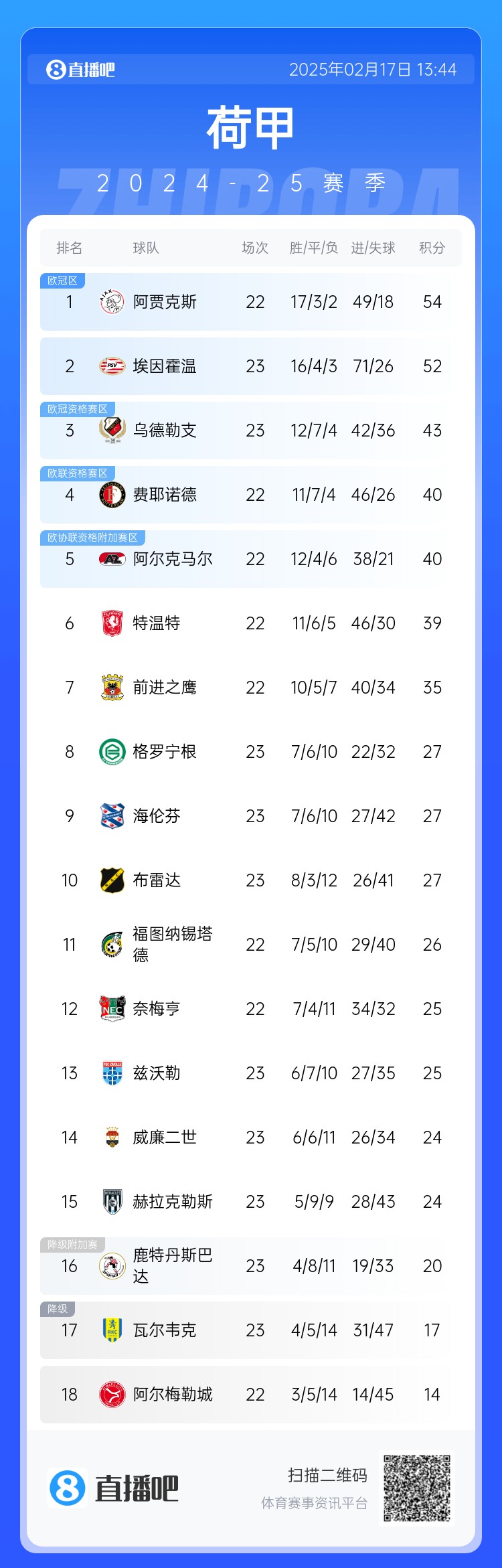 此外,周中這兩家爭(zhēng)冠的荷甲豪門還都有歐戰(zhàn)任務(wù),不過阿賈克斯首回合2-0勝圣吉羅斯,埃因霍溫則比較艱難,他們首回合1-2不敵尤文圖斯。