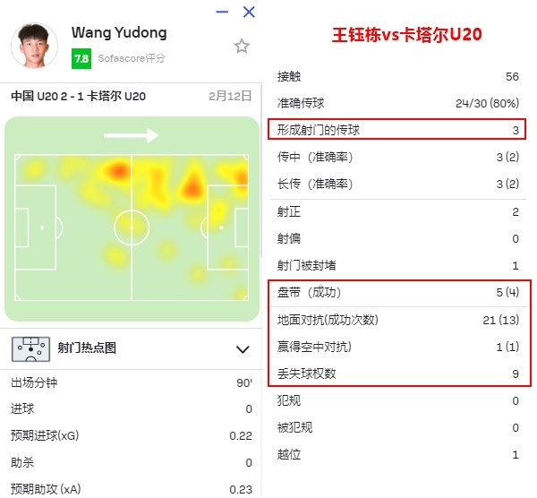 從對戰(zhàn)卡塔爾U20比賽中的數(shù)據(jù)可以看到,王鈺棟5次過人4次成功,22次一對一對抗贏下14次,送出3次帶來射門的關(guān)鍵傳球。