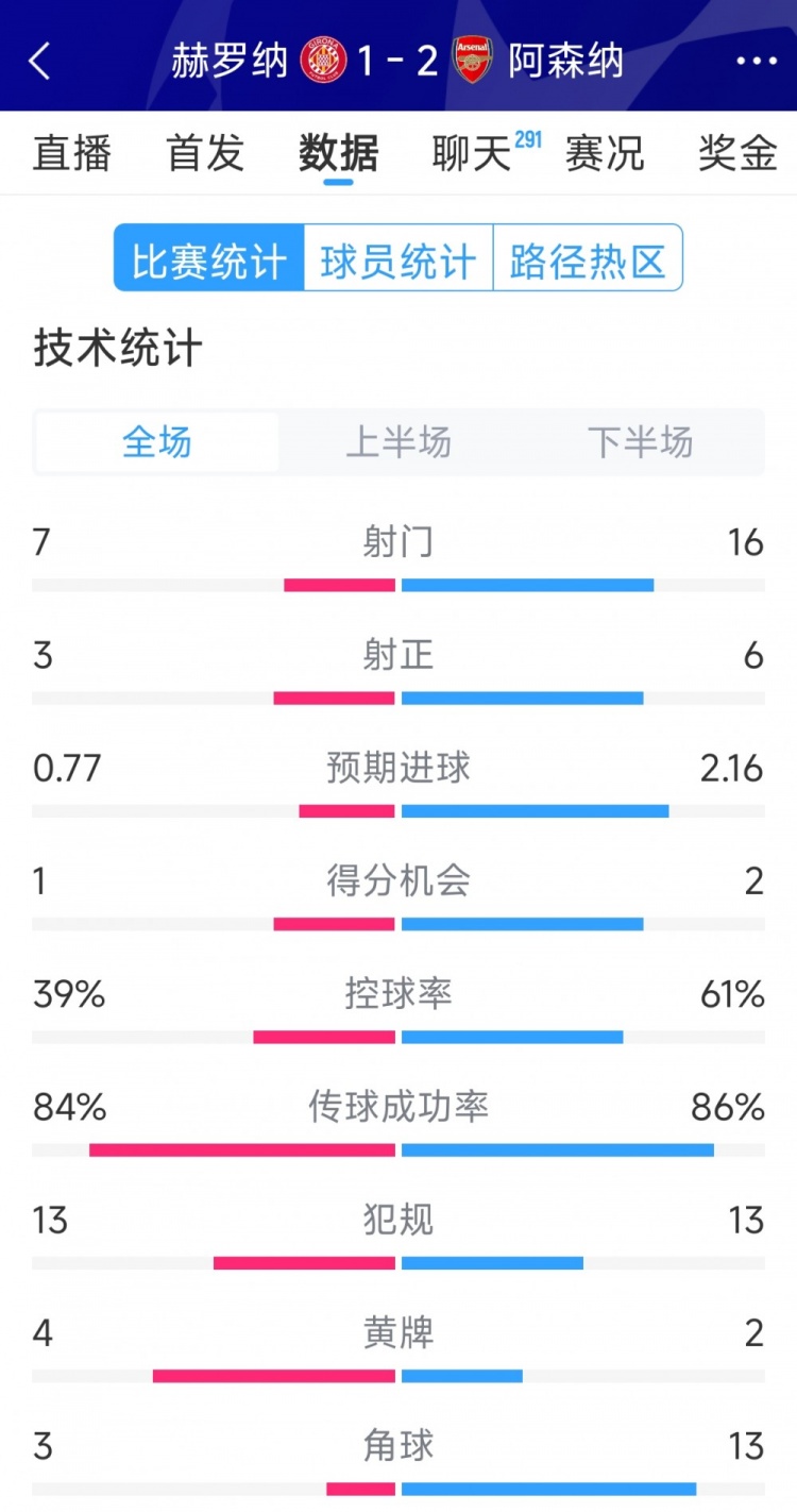 1月30日訊 在本輪歐冠,阿森納2-1擊敗赫羅納,以下為雙方全場數(shù)據(jù)對比:赫羅納vs阿森納射門:7-16射正:3-6預(yù)期進(jìn)球:0.77-2.16得分機會:1-2控球率:39%-61%傳球成功率:84%-86%犯規(guī):13-13黃牌:4-2角球:3-13 本文標(biāo)簽: 足球 英超 阿森納