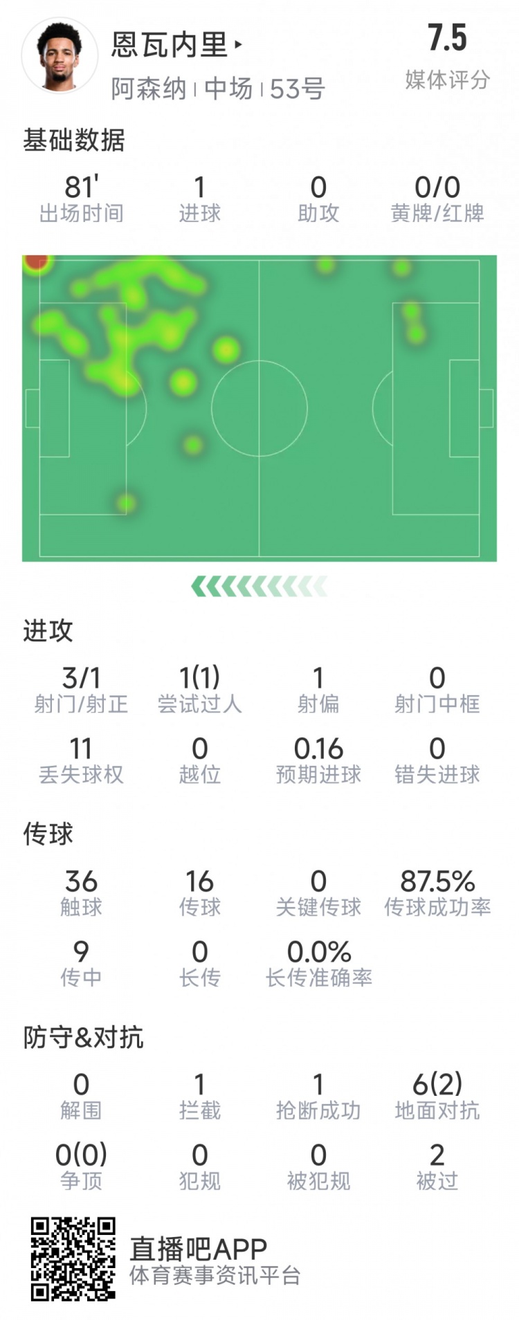 1月30日訊 在本輪歐冠阿森納對(duì)陣赫羅納的比賽中,恩瓦內(nèi)里表現(xiàn)出色,以下為他在本場(chǎng)數(shù)據(jù):