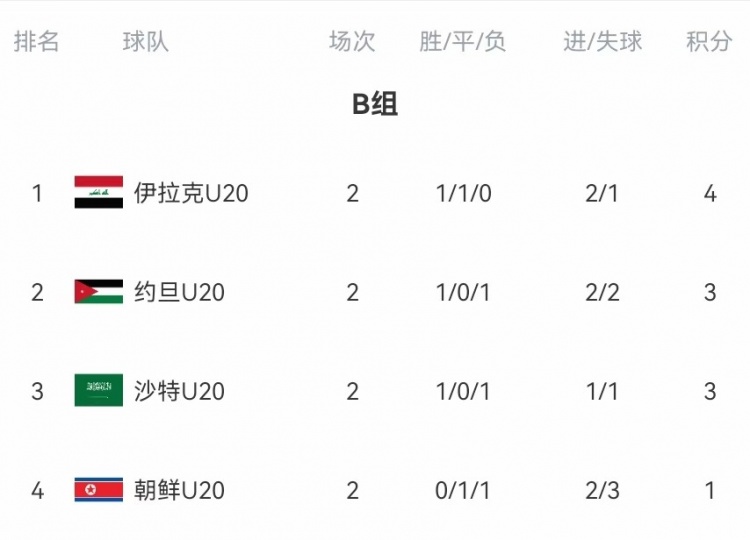 不過(guò)B組當(dāng)前形勢(shì)較為復(fù)雜,沙特U20將在末輪對(duì)陣朝鮮U20、伊拉克U20則將和約旦U20對(duì)話。4支球隊(duì)均存在晉級(jí)可能和出局可能。除了朝鮮U20之外,其他3隊(duì)都可能成為小組頭名。由于B組末輪比賽將在明日才會(huì)開(kāi)戰(zhàn),也無(wú)從參考。