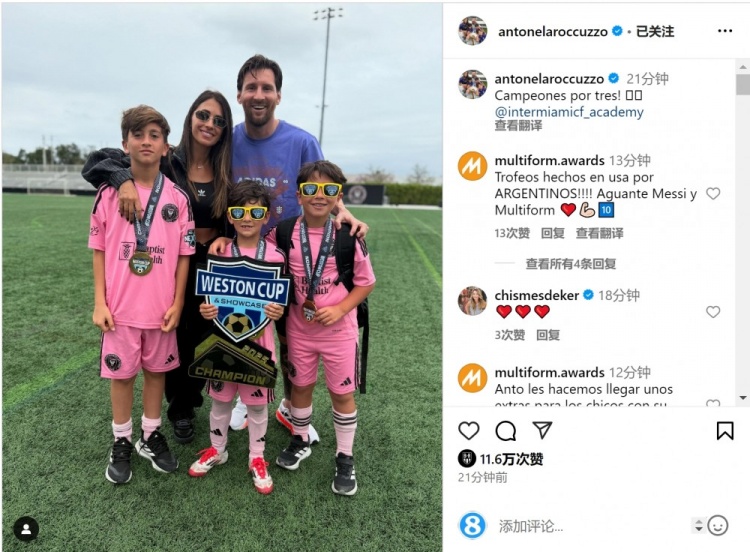 2月18日訊 梅西妻子安東內(nèi)拉更新社媒動態(tài),曬出一家的合照。梅西的三個兒子隨邁阿密國際青訓(xùn)梯隊參加韋斯頓杯比賽,安東內(nèi)拉社媒曬出一家人的合照,蒂亞戈、馬特奧、西羅均佩戴冠軍獎牌,配文:“三個冠軍!” 本文標簽: 足球 邁阿密國際 梅西